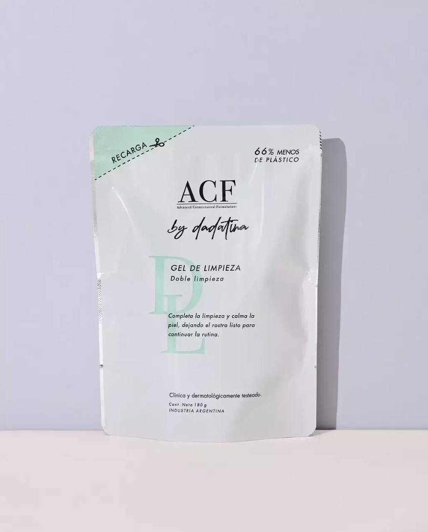 Envase ecológico para rellenar tu GEL DE LIMPIEZA ACF by DADATINA, cada envase utiliza 66% menos plástico.
